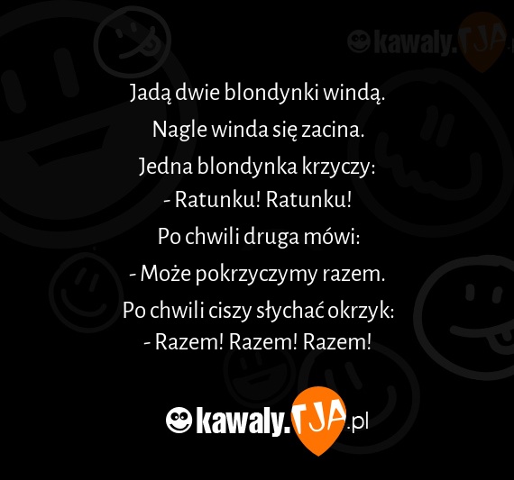 Jada dwie blondynki winda. Nagle winda sie zacina. Jedna blondynka krzyczy: - Ratunku! Ratunku! Po chwili druga mowi: - Moze pokrzyczymy razem. Po chwili ciszy slychac okrzyk: - Razem! Razem! Razem!