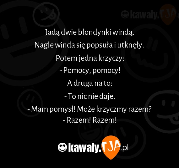 Jadą dwie blondynki windą. Nagle winda się popsuła i utknęły. Potem jedna krzyczy: - Pomocy, pomocy! A druga na to: - To nic nie daje. - Mam pomysł! Może krzyczmy razem? - Razem! Razem!