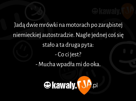 Jadą dwie mrówki na motorach po zarąbistej niemieckiej autostradzie. Nagle jednej coś się stało a ta druga pyta: - Co ci jest? - Mucha wpadła mi do oka.