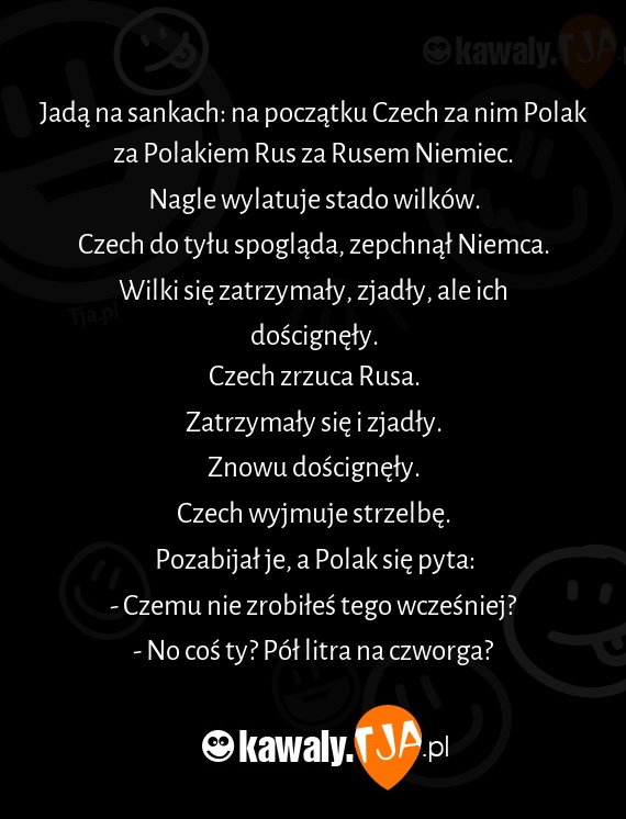 Jadą na sankach: na początku Czech za nim Polak za Polakiem Rus za Rusem Niemiec.