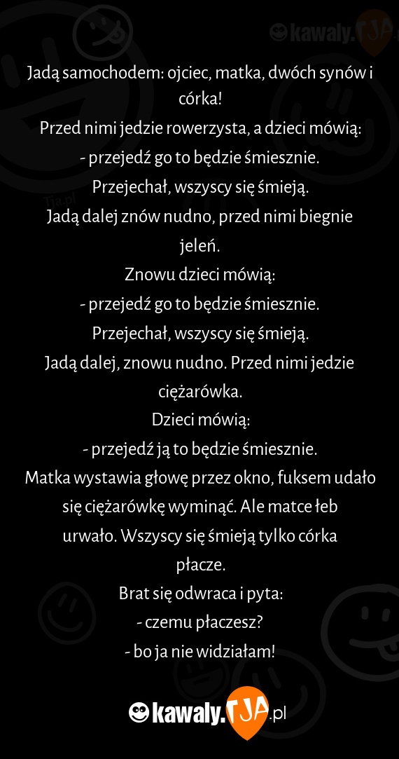 Matka wystawia głowę przez okno, fuksem udało się ciężarówkę wyminąć. Ale matce łeb urwało. Wszyscy się śmieją tylko córka płacze.