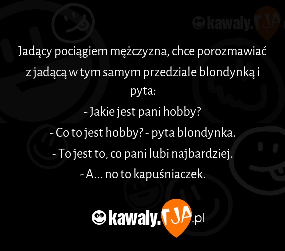 Jadący pociągiem mężczyzna, chce porozmawiać z jadącą w tym samym przedziale blondynką i pyta: - Jakie jest pani hobby? - Co to jest hobby? - pyta blondynka. - To jest to, co pani lubi najbardziej. - A... no to kapuśniaczek.