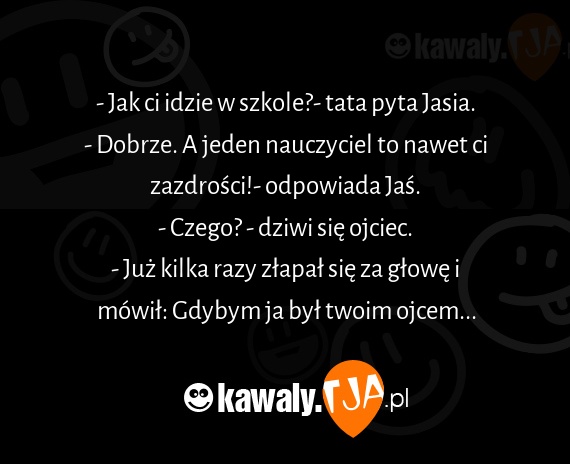 - Jak ci idzie w szkole?- tata pyta Jasia. - Dobrze. A jeden nauczyciel to nawet ci zazdrości!- odpowiada Jaś. - Czego? - dziwi się ojciec. - Już kilka razy złapał się za głowę i mówił: Gdybym ja był twoim ojcem...