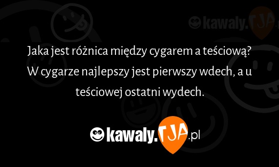 Jaka jest roznica miedzy cygarem a tesciowa? W cygarze najlepszy jest pierwszy wdech, a u tesciowej ostatni wydech.