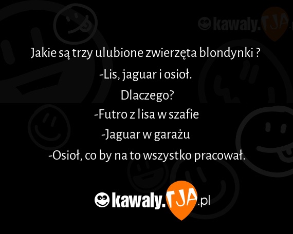 Jakie sa trzy ulubione zwierzeta blondynki ? -Lis, jaguar i osiol. Dlaczego? -Futro z lisa w szafie -Jaguar w garazu -Osiol, co by na to wszystko pracowal.