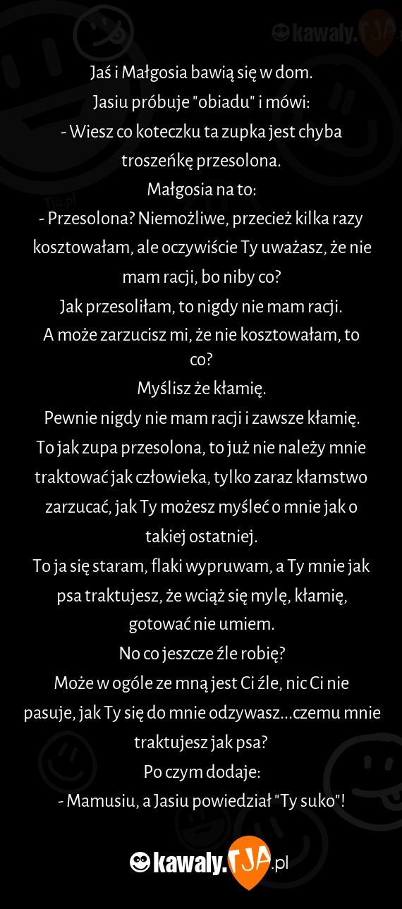 - Przesolona? Niemożliwe, przecież kilka razy kosztowałam, ale oczywiście Ty uważasz, że nie mam racji, bo niby co?
