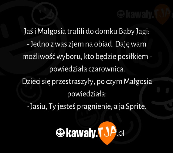 Jas i Malgosia trafili do domku Baby Jagi: - Jedno z was zjem na obiad. Daje wam mozliwosc wyboru, kto bedzie posilkiem - powiedziala czarownica. Dzieci sie przestraszyly, po czym Malgosia powiedziala: - Jasiu, Ty jestes pragnienie, a ja Sprite.