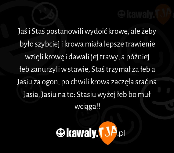 Jaś i Staś postanowili wydoić krowę, ale żeby było szybciej i krowa miała lepsze trawienie wzięli krowę i dawali jej trawy, a później łeb zanurzyli w stawie, Staś trzymał za łeb a Jasiu za ogon, po chwili krowa zaczęła srać na Jasia, Jasiu na to: Stasiu wyżej łeb bo muł wciąga!!