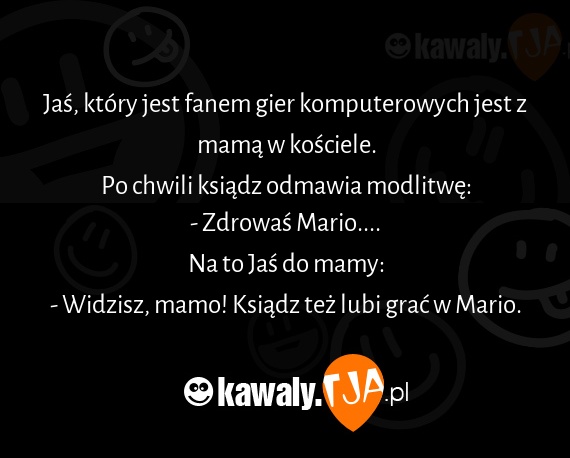 Jaś, który jest fanem gier komputerowych jest z mamą w kościele. Po chwili ksiądz odmawia modlitwę: - Zdrowaś Mario.... Na to Jaś do mamy: - Widzisz, mamo! Ksiądz też lubi grać w Mario.