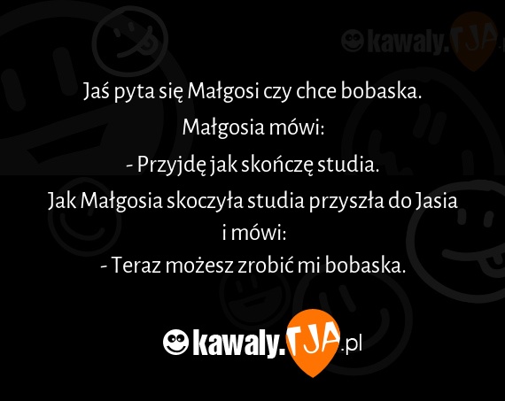 Jas pyta sie Malgosi czy chce bobaska. Malgosia mowi: - Przyjde jak skoncze studia. Jak Malgosia skoczyla studia przyszla do Jasia i mowi: - Teraz mozesz zrobic mi bobaska.