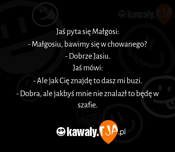 Jas pyta sie Malgosi: - Malgosiu, bawimy sie w chowanego? - Dobrze Jasiu. Jas mowi: - Ale jak Cie znajde to dasz mi buzi. - Dobra, ale jakbys mnie nie znalazl to bede w szafie.