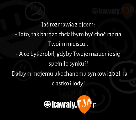 Jaś rozmawia z ojcem: - Tato, tak bardzo chciałbym być choć raz na Twoim miejscu.. - A co byś zrobił, gdyby Twoje marzenie się spełniło synku?! - Dałbym mojemu ukochanemu synkowi 20 zł na ciastko i lody!