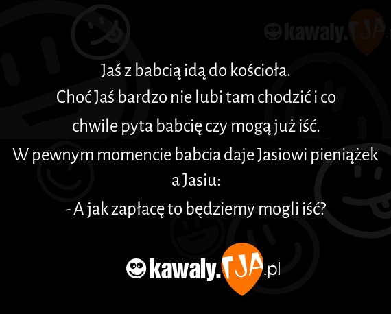 Jaś z babcią idą do kościoła. Choć Jaś bardzo nie lubi tam chodzić i co chwile pyta babcię czy mogą już iść. W pewnym momencie babcia daje Jasiowi pieniążek a Jasiu: - A jak zapłacę to będziemy mogli iść?