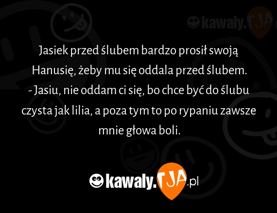 Jasiek przed slubem bardzo prosil swoja Hanusie, zeby mu sie oddala przed slubem. - Jasiu, nie oddam ci sie, bo chce byc do slubu czysta jak lilia, a poza tym to po rypaniu zawsze mnie glowa boli.