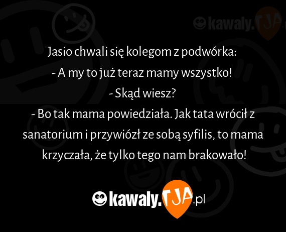 Jasio chwali się kolegom z podwórka: - A my to już teraz mamy wszystko! - Skąd wiesz? - Bo tak mama powiedziała. Jak tata wrócił z sanatorium i przywiózł ze sobą syfilis, to mama krzyczała, że tylko tego nam brakowało!