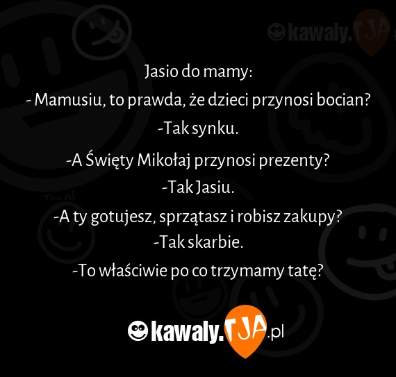 Jasio do mamy: - Mamusiu, to prawda, że dzieci przynosi bocian? -Tak synku. -A Święty Mikołaj przynosi prezenty? -Tak Jasiu. -A ty gotujesz, sprzątasz i robisz zakupy? -Tak skarbie. -To właściwie po co trzymamy tatę?