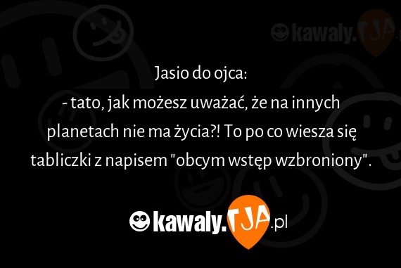 Jasio do ojca: - tato, jak mozesz uwazac, ze na innych planetach nie ma zycia?! To po co wiesza sie tabliczki z napisem "obcym wstep wzbroniony".