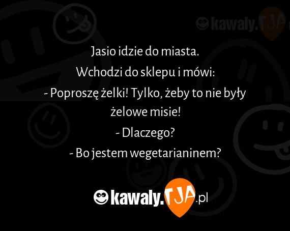 Jasio idzie do miasta. Wchodzi do sklepu i mowi: - Poprosze zelki! Tylko, zeby to nie byly zelowe misie! - Dlaczego? - Bo jestem wegetarianinem?