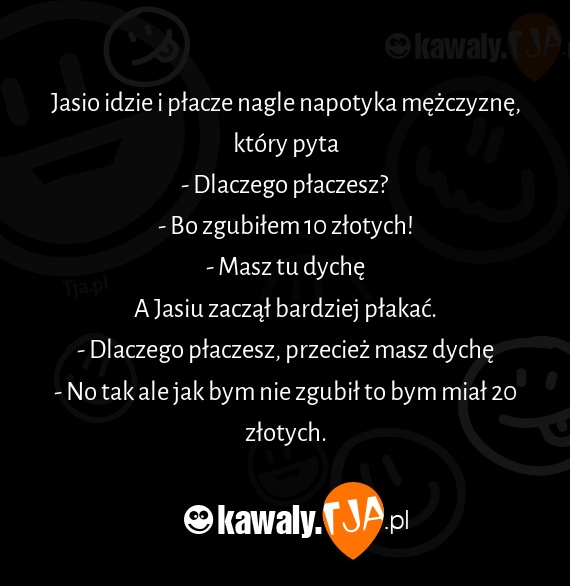 Jasio idzie i płacze nagle napotyka mężczyznę, który pyta - Dlaczego płaczesz? - Bo zgubiłem 10 złotych! - Masz tu dychę A Jasiu zaczął bardziej płakać. - Dlaczego płaczesz, przecież masz dychę - No tak ale jak bym nie zgubił to bym miał 20 złotych.