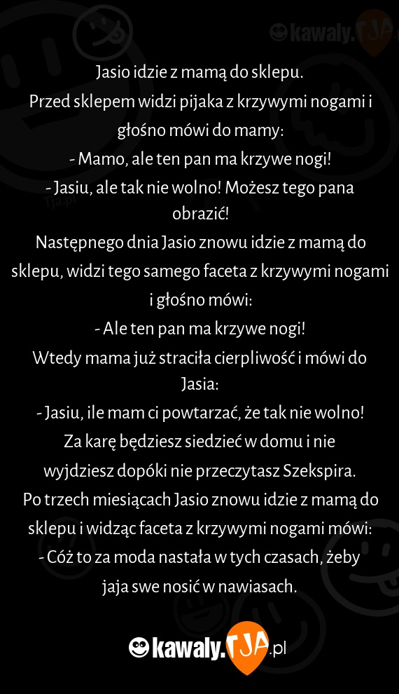 - Jasiu, ile mam ci powtarzać, że tak nie wolno! Za karę będziesz siedzieć w domu i nie wyjdziesz dopóki nie przeczytasz Szekspira.