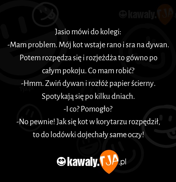 -Mam problem. Mój kot wstaje rano i sra na dywan. Potem rozpędza się i rozjeżdża to gówno po całym pokoju. Co mam robić?