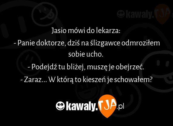 Jasio mowi do lekarza: - Panie doktorze, dzis na slizgawce odmrozilem sobie ucho. - Podejdx tu blizej, musze je obejrzec. - Zaraz... W ktora to kieszen je schowalem?