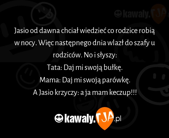 Jasio od dawna chciał wiedzieć co rodzice robią w nocy. Więc następnego dnia wlazł do szafy u rodziców. No i słyszy: Tata: Daj mi swoją bułkę. Mama: Daj mi swoją parówkę. A Jasio krzyczy: a ja mam keczup!!!