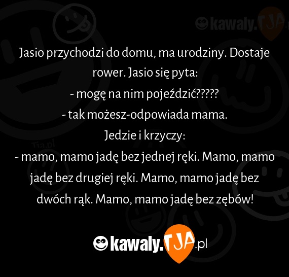 Jasio przychodzi do domu, ma urodziny. Dostaje rower. Jasio się pyta:
