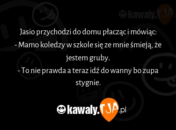 Jasio przychodzi do domu płacząc i mówiąc: - Mamo koledzy w szkole się ze mnie śmieją, że jestem gruby. - To nie prawda a teraz idź do wanny bo zupa stygnie.