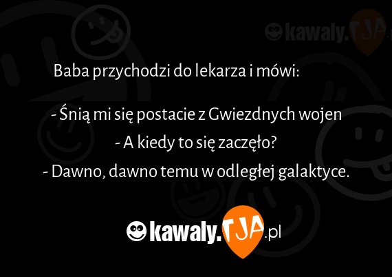 Baba przychodzi do lekarza i mowi: - Snia mi sie postacie z Gwiezdnych wojen - A kiedy to sie zaczelo? - Dawno, dawno temu w odleglej galaktyce.