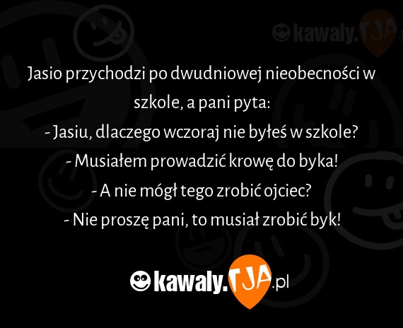 Jasio przychodzi po dwudniowej nieobecności w szkole, a pani pyta: - Jasiu, dlaczego wczoraj nie byłeś w szkole? - Musiałem prowadzić krowę do byka! - A nie mógł tego zrobić ojciec? - Nie proszę pani, to musiał zrobić byk!