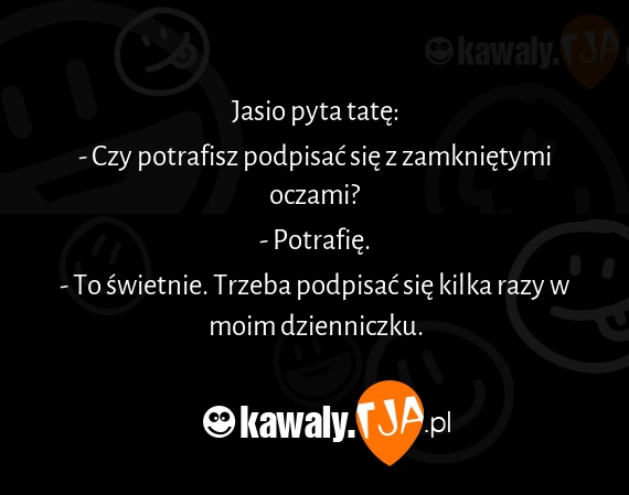 Jasio pyta tate: - Czy potrafisz podpisac sie z zamknietymi oczami? - Potrafie. - To swietnie. Trzeba podpisac sie kilka razy w moim dzienniczku.