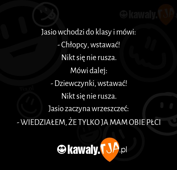 Jasio wchodzi do klasy i mówi: - Chłopcy, wstawać! Nikt się nie rusza. Mówi dalej: - Dziewczynki, wstawać! Nikt się nie rusza. Jasio zaczyna wrzeszczeć: - WIEDZIAŁEM, ŻE TYLKO JA MAM OBIE PŁCI