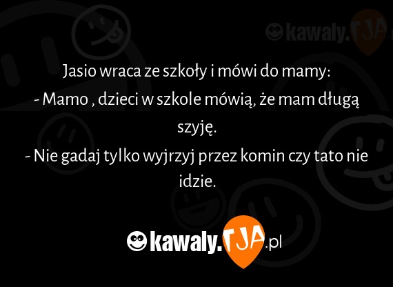 Jasio wraca ze szkoły i mówi do mamy: - Mamo , dzieci w szkole mówią, że mam długą szyję. - Nie gadaj tylko wyjrzyj przez komin czy tato nie idzie.