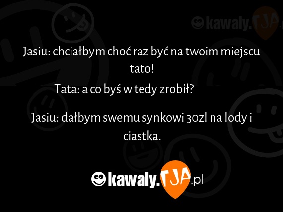 Jasiu: chciałbym choć raz być na twoim miejscu tato! Tata: a co byś w tedy zrobił? Jasiu: dałbym swemu synkowi 30zl na lody i ciastka.