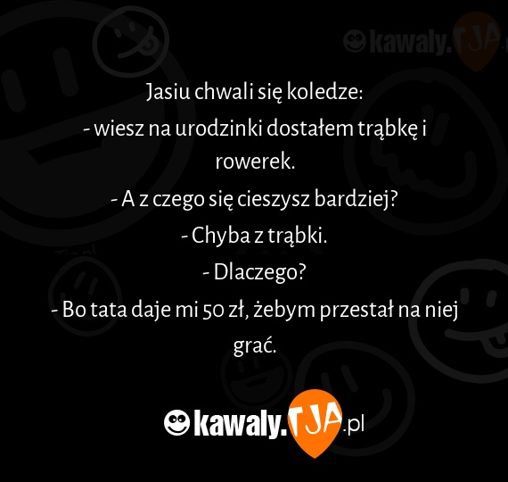 Jasiu chwali sie koledze: - wiesz na urodzinki dostalem trabke i rowerek. - A z czego sie cieszysz bardziej? - Chyba z trabki. - Dlaczego? - Bo tata daje mi 50 zl, zebym przestal na niej grac.