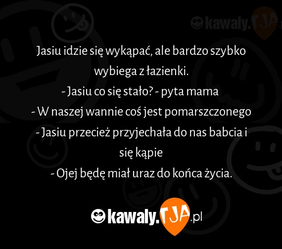 Jasiu idzie się wykąpać, ale bardzo szybko wybiega z łazienki. - Jasiu co się stało? - pyta mama - W naszej wannie coś jest pomarszczonego - Jasiu przecież przyjechała do nas babcia i się kąpie - Ojej będę miał uraz do końca życia.