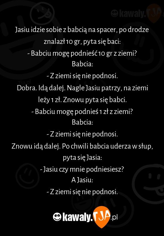 Jasiu idzie sobie z babcią na spacer, po drodze znalazł 10 gr, pyta się baci: