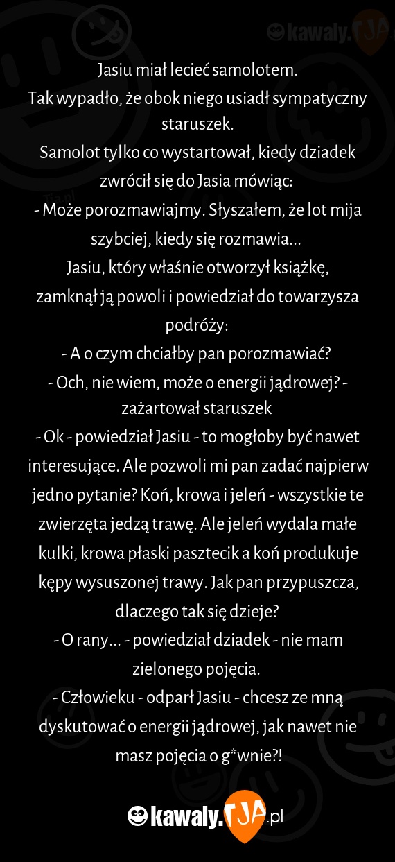 - Człowieku - odparł Jasiu - chcesz ze mną dyskutować o energii jądrowej, jak nawet nie masz pojęcia o g*wnie?!