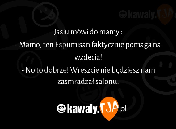 Jasiu mowi do mamy : - Mamo, ten Espumisan faktycznie pomaga na wzdecia! - No to dobrze! Wreszcie nie bedziesz nam zasmradzal salonu.