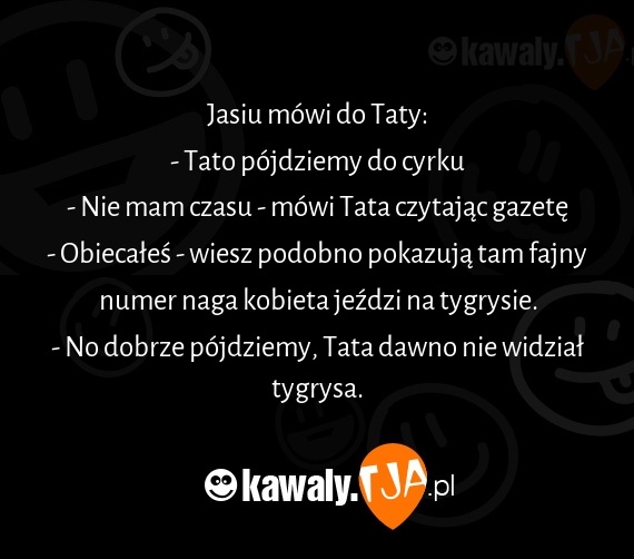 Jasiu mowi do Taty: - Tato pojdziemy do cyrku - Nie mam czasu - mowi Tata czytajac gazete - Obiecales - wiesz podobno pokazuja tam fajny numer naga kobieta jexdzi na tygrysie. - No dobrze pojdziemy, Tata dawno nie widzial tygrysa.