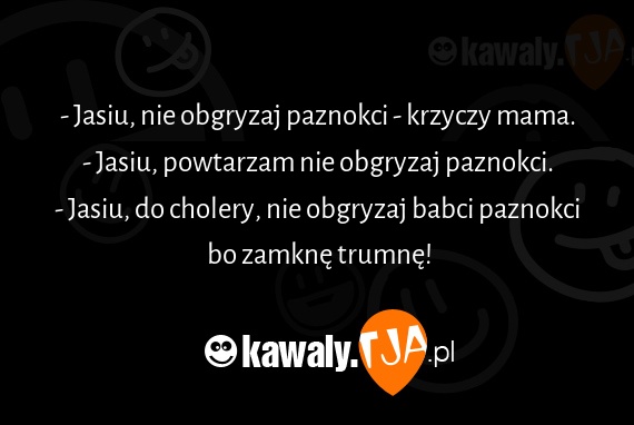 - Jasiu, nie obgryzaj paznokci - krzyczy mama. - Jasiu, powtarzam nie obgryzaj paznokci. - Jasiu, do cholery, nie obgryzaj babci paznokci bo zamkne trumne!