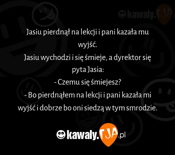Jasiu pierdnal na lekcji i pani kazala mu wyjsc. Jasiu wychodzi i sie smieje, a dyrektor sie pyta Jasia: - Czemu sie smiejesz? - Bo pierdnalem na lekcji i pani kazala mi wyjsc i dobrze bo oni siedza w tym smrodzie.
