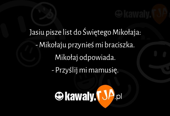Jasiu pisze list do Świętego Mikołaja: - Mikołaju przynieś mi braciszka. Mikołaj odpowiada. - Przyślij mi mamusię.