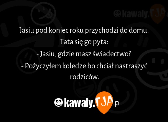 Jasiu pod koniec roku przychodzi do domu. Tata się go pyta: - Jasiu, gdzie masz świadectwo? - Pożyczyłem koledze bo chciał nastraszyć rodziców.