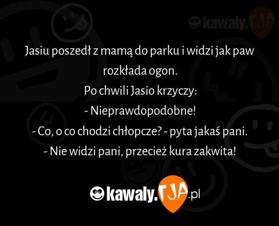 Jasiu poszedl z mama do parku i widzi jak paw rozklada ogon. Po chwili Jasio krzyczy: - Nieprawdopodobne! - Co, o co chodzi chlopcze? - pyta jakas pani. - Nie widzi pani, przeciez kura zakwita!
