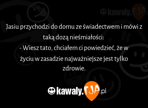 Jasiu przychodzi do domu ze świadectwem i mówi z taką dozą nieśmiałości: - Wiesz tato, chciałem ci powiedzieć, że w życiu w zasadzie najważniejsze jest tylko zdrowie.