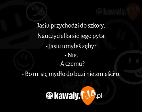 Jasiu przychodzi do szkoły. Nauczycielka się jego pyta: - Jasiu umyłeś zęby? - Nie. - A czemu? - Bo mi się mydło do buzi nie zmieściło.