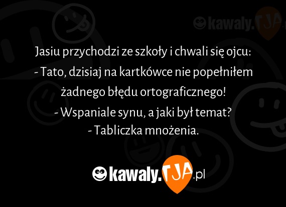 Jasiu przychodzi ze szkoły i chwali się ojcu: - Tato, dzisiaj na kartkówce nie popełniłem żadnego błędu ortograficznego! - Wspaniale synu, a jaki był temat? - Tabliczka mnożenia.