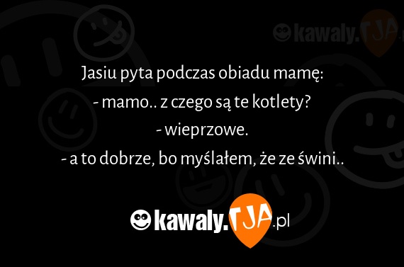 Jasiu pyta podczas obiadu mame: - mamo.. z czego sa te kotlety? - wieprzowe. - a to dobrze, bo myslalem, ze ze swini..